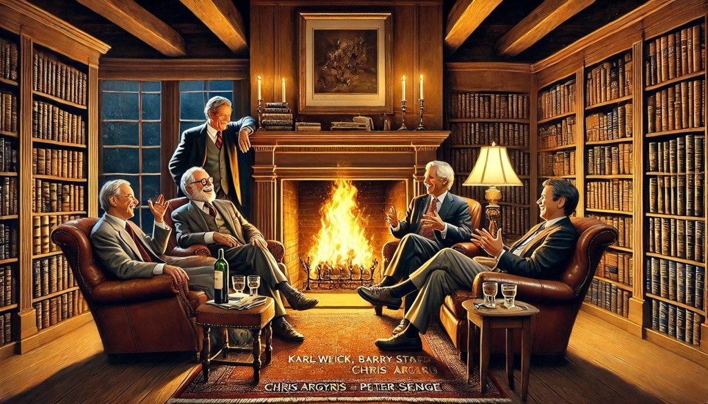 In a warm library with a roaring fireplace, Peter Senge hosts a fireside chat featuring Karl Weick, Barry Staw, and Chris Argyris. The topic: why humans and organizations behave like psychological oobleck—flexible under gradual change but rigid when hit with force—and how to help them assimilate radical transformation. The conversation is fueled by wit, wisdom, and several bottles of wine.
